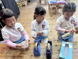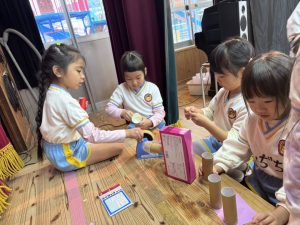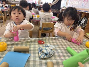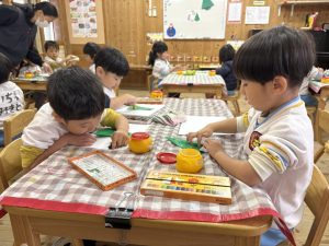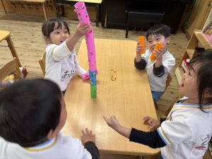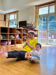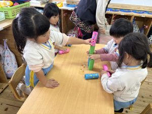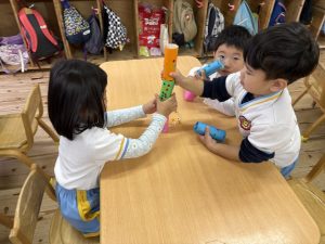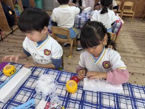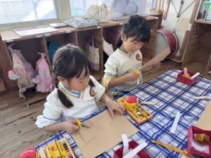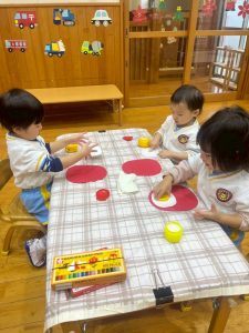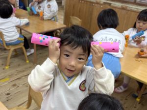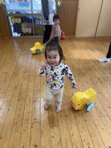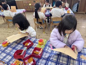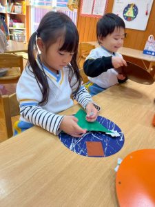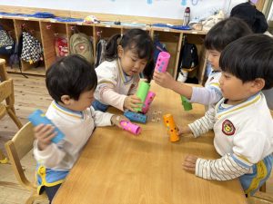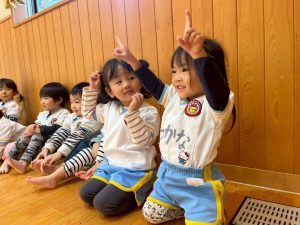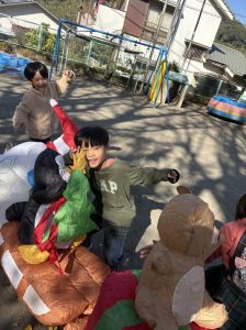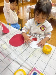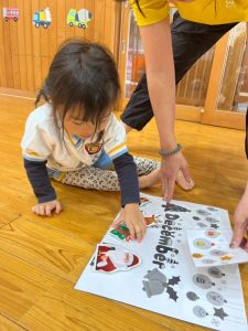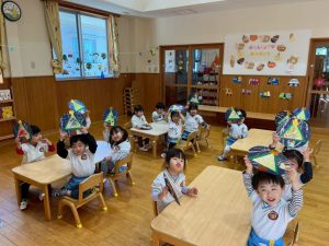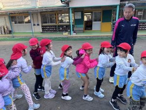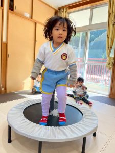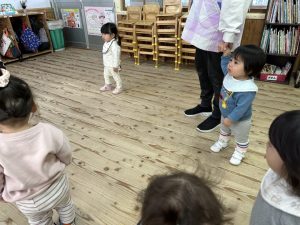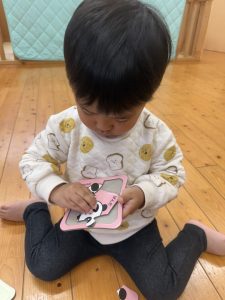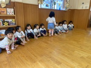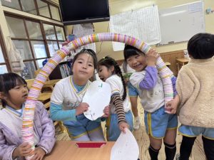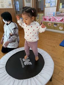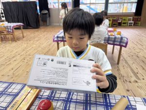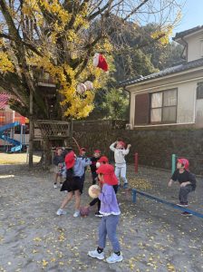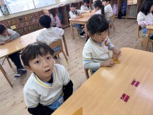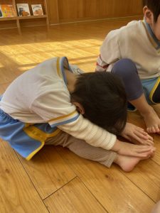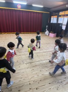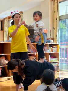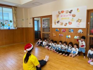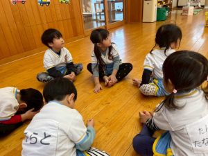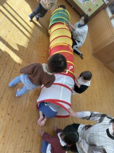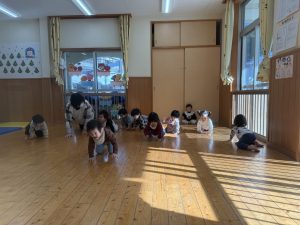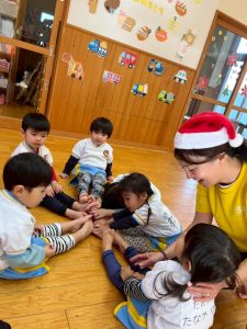 8日(月)はたんぽぽ組で,のびのび遊びがありました。クリスマスカードを使った運動を楽しみました‼