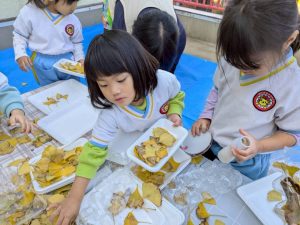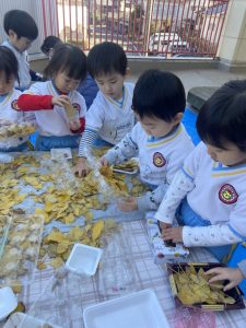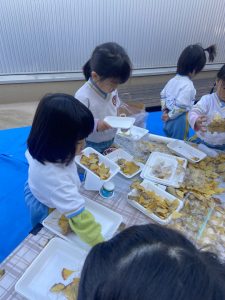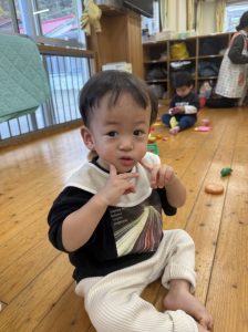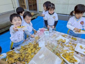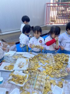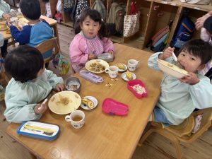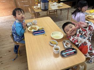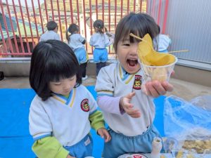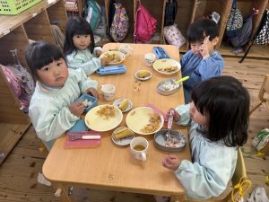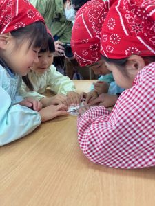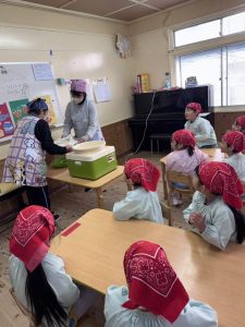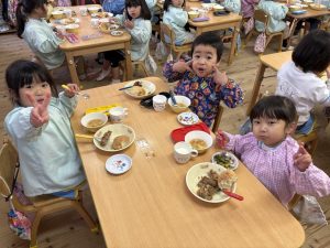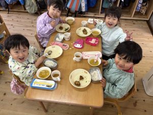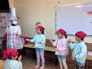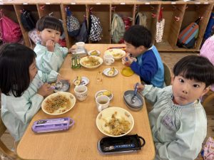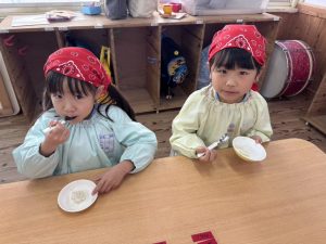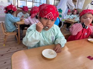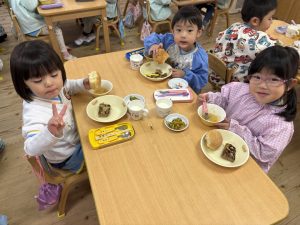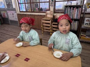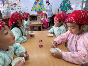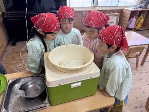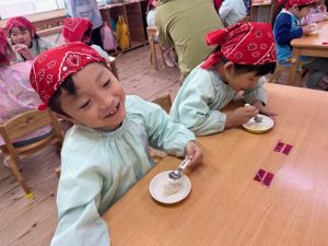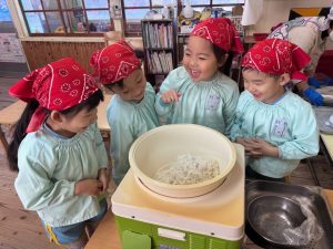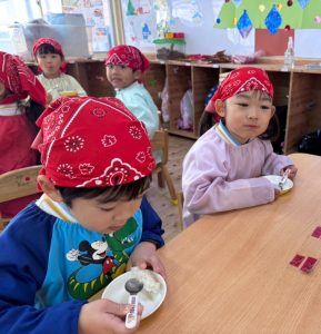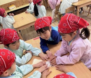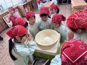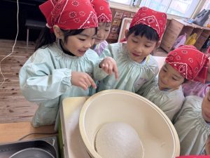 16日(火)きく組が食育活動で鏡餅作りをしました。炊き立てのおこわが甘く,モチモチしていてとてもおいしかったです(*’ω’*)
