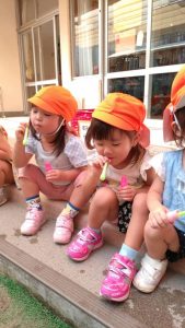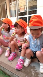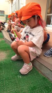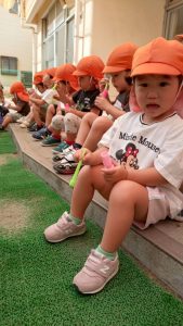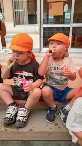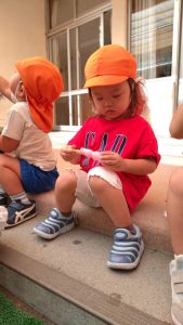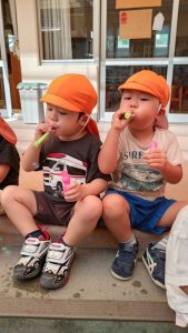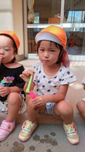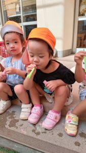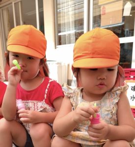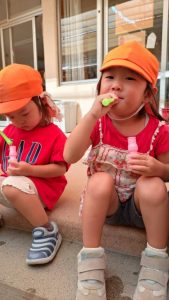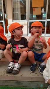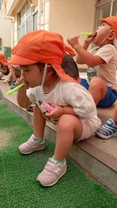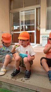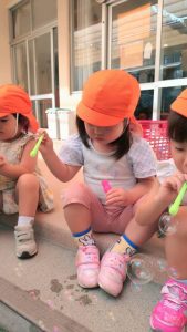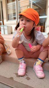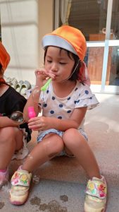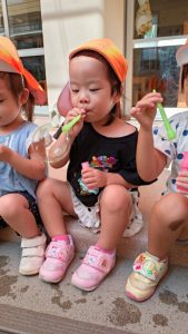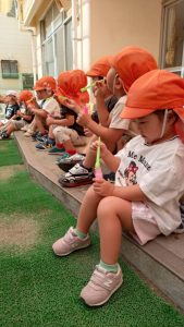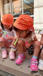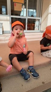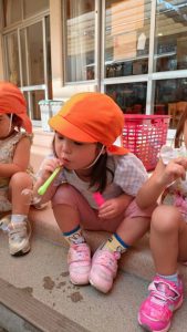 少し暑さが和らいだ園庭で、すみれ組さんが初めてシャボン玉をしました🫧🫧🫧😆😆