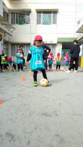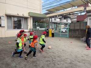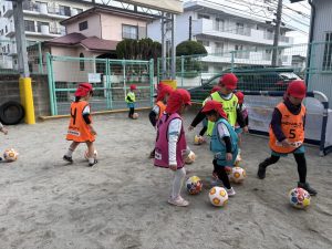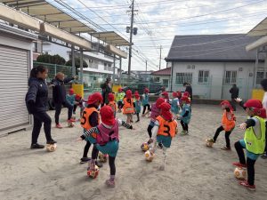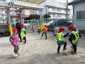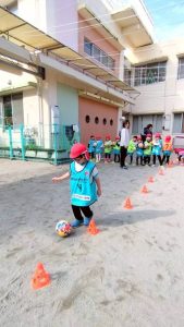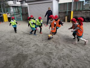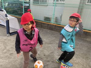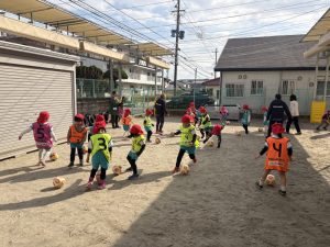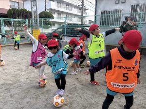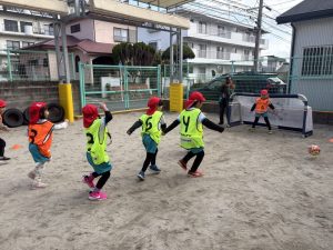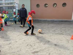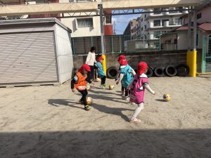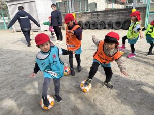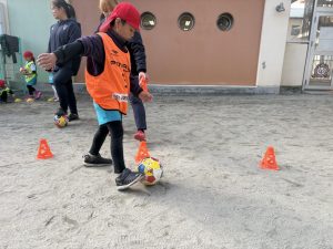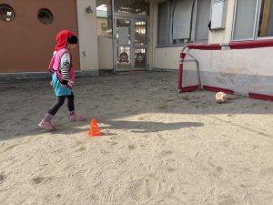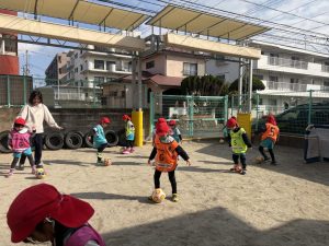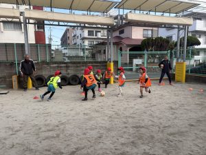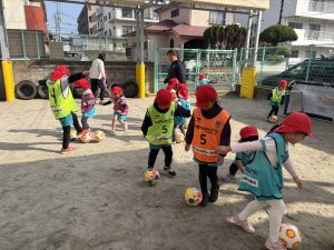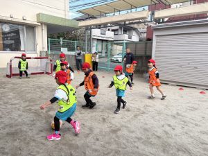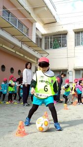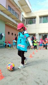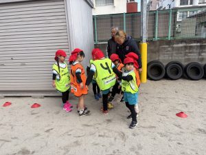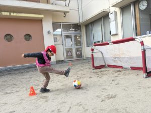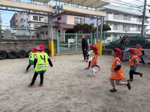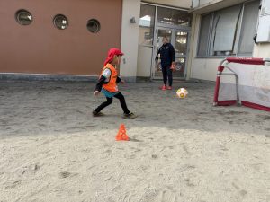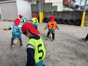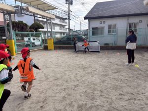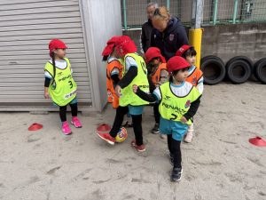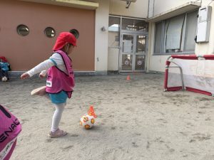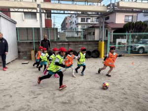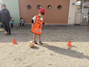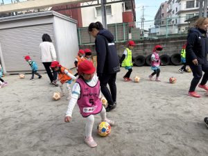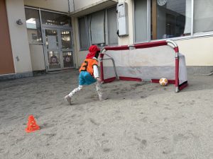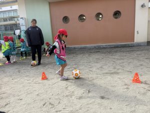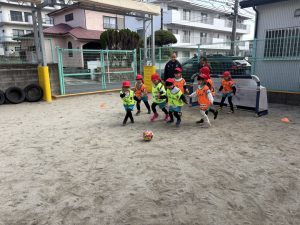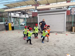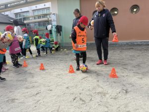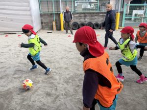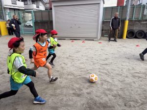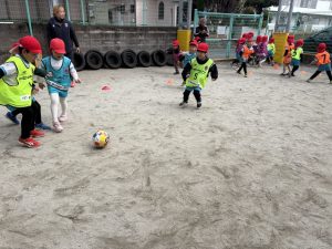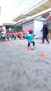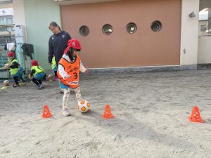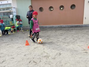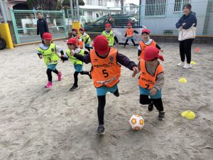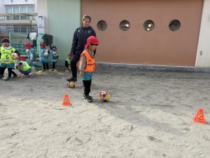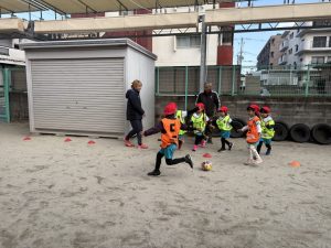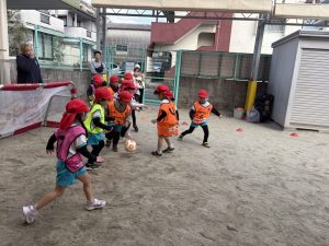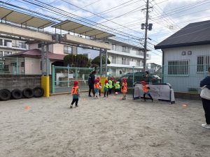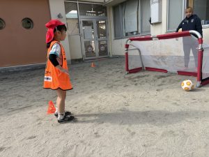 まずは体力作りから始まり、ボールを使った遊びを行ったあと、最後は試合をしました⚽サッカーが好きな子もそうでない子も楽しくサッカーを経験できました!”