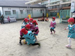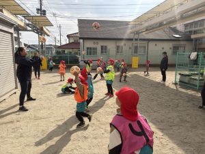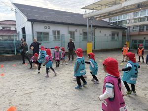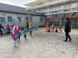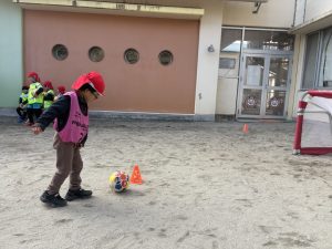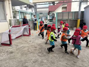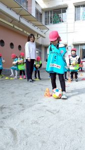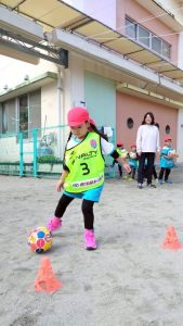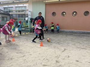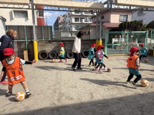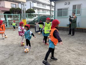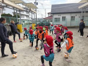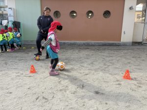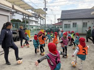 12月5日 ⚽⚽鹿児島県サッカー協会によるサッカー教室が行われ、鹿児島女子サッカーチーム「ミッゴリーサ」のお二人が来園しました。さくら組さんが参加しました!!